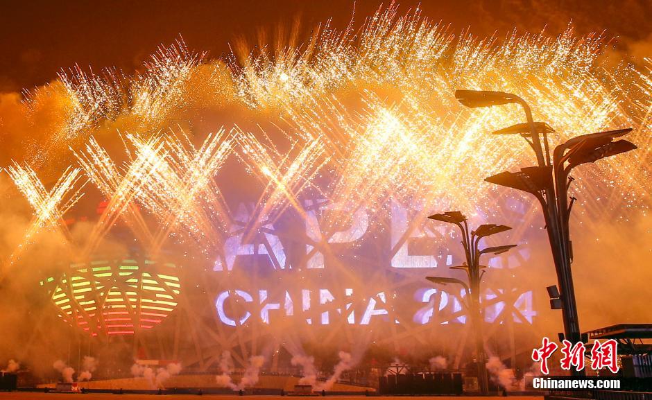 11月10日晚,北京在奥林匹克公园举行焰火表演。APEC领导人观看了焰火表演。 中新社发 张浩 摄