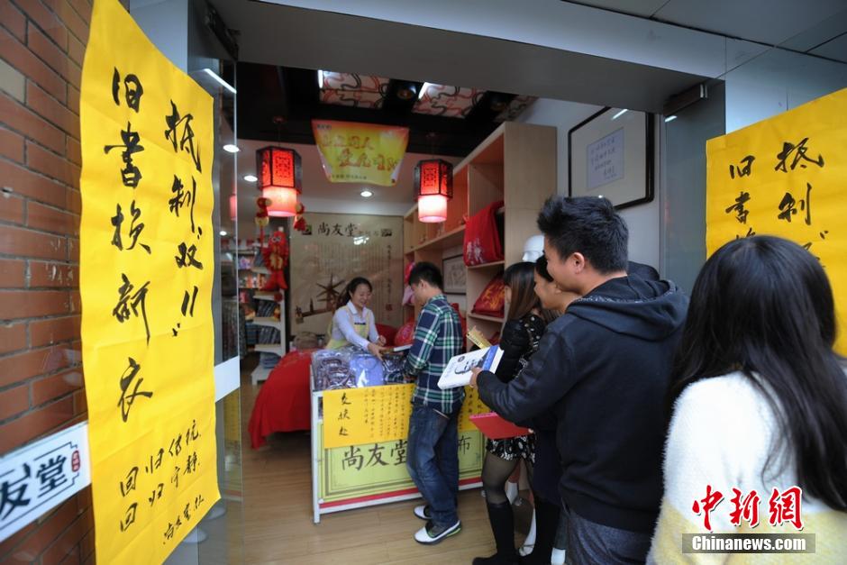 11月10日,“双十一”网购节将至,长沙一实体店铺在店外挂出了“抵制双十一,旧书换新衣”等标语,吸引了众多市民前来用旧书换购新衣。该店店长介绍,希望通过此活动在“双十一”期间,呼吁消费者理性消费,回归传统。 杨华峰 摄