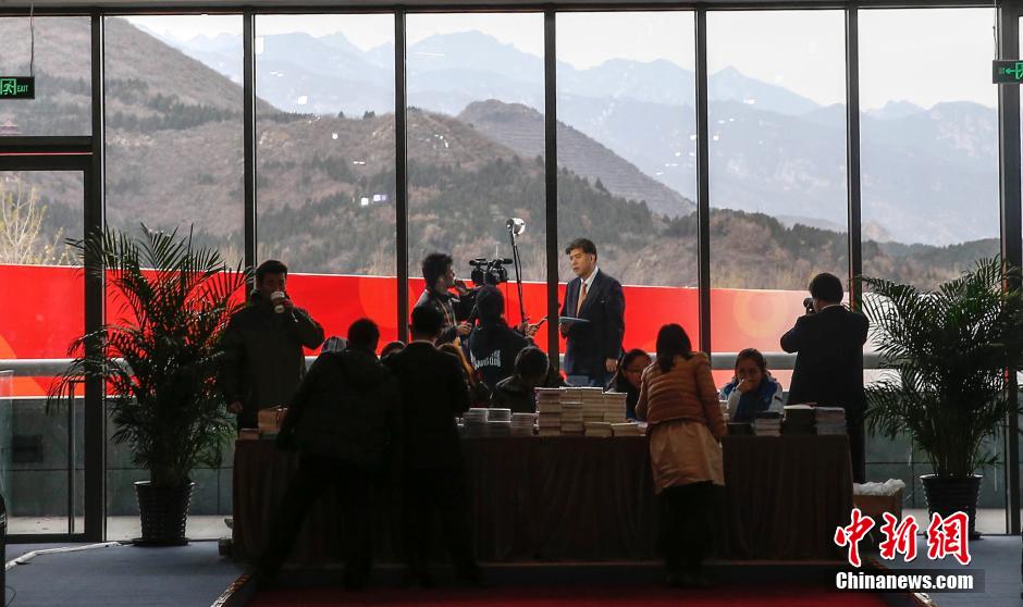 11月11日,APEC领导人非正式会议在北京雁栖湖国际会议中心举行,图为APEC领导人非正式会议新闻中心内,一名记者在群山的背景下出镜报道。中新社发 张浩 摄