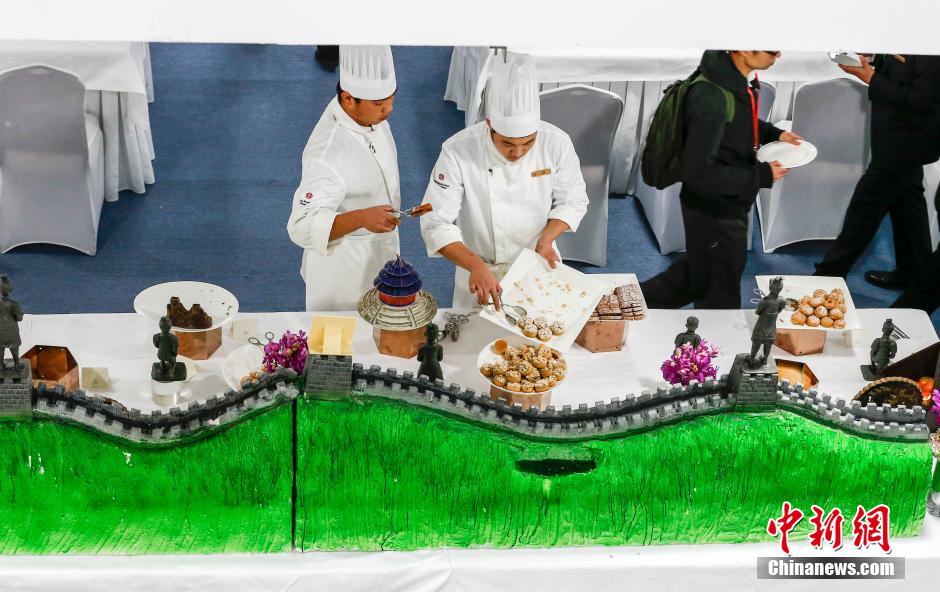 11月11日,APEC领导人非正式会议在北京雁栖湖国际会议中心举行,图为APEC领导人非正式会议新闻中心的餐厅摆出了长城的造型。中新社发 张浩 摄