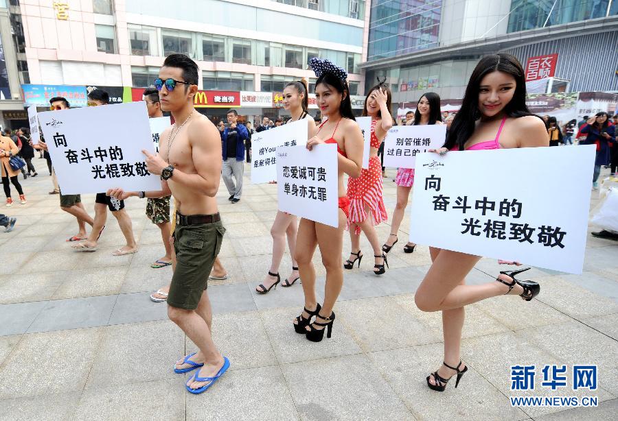 11月11日,模特在进行“光棍可贵”行为艺术表演。当日,由房地产商推出的一场以“光棍可贵”为主题的表演活动在南京新街口正洪街广场举行,模特们举着“向奋斗中的光棍致敬”等内容的标语牌进行巡游表演。新华社记者孙参摄