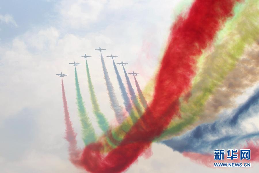 11月11日,阿联酋“骑士”飞行表演队做特技动作,7架MB-339飞机拉出阿联酋国旗的颜色。当日,阿联酋“骑士”飞行队在珠海航展开幕式上表演,这是他们第一次在中国进行飞行表演。阿联酋骑士飞行表演队成立于2010年。2010年7月,8位阿联酋空军的战斗机飞行员前往意大利瑞摩特空军基地培训,并在2011年11月13日,在迪拜航展首日进行了第一次公开特技飞行展示。骑士队使用意大利马基公司生产的MB-339轻型教练/攻击机。通常使用6架Aermacchi MB-339进行表演,第7架作为备份机。座机的涂装主要是金色和黑色。金色代表阿联酋的沙漠,黑色代表沙漠之下的石油。飞机垂尾是以金色为主的鹰翼图案,两侧机翼下表面为阿联酋国旗图案。新华社发(王强摄)