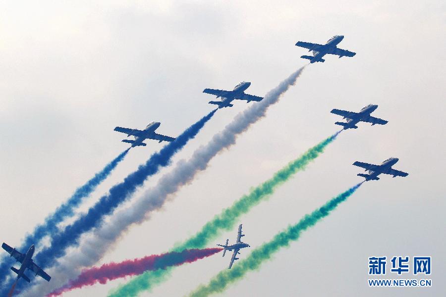 11月11日,阿联酋“骑士”飞行表演队做特技动作,7架MB-339飞机拉出阿联酋国旗的颜色。当日,阿联酋“骑士”飞行队在珠海航展开幕式上表演,这是他们第一次在中国进行飞行表演。阿联酋骑士飞行表演队成立于2010年。2010年7月,8位阿联酋空军的战斗机飞行员前往意大利瑞摩特空军基地培训,并在2011年11月13日,在迪拜航展首日进行了第一次公开特技飞行展示。骑士队使用意大利马基公司生产的MB-339轻型教练/攻击机。通常使用6架Aermacchi MB-339进行表演,第7架作为备份机。座机的涂装主要是金色和黑色。金色代表阿联酋的沙漠,黑色代表沙漠之下的石油。飞机垂尾是以金色为主的鹰翼图案,两侧机翼下表面为阿联酋国旗图案。新华社发(王强摄)