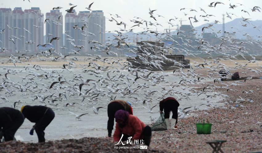 2014年11月12日,山东省烟台市正值秋冬,烟台高新区沿海养殖户开始收获扇贝,渔民加工扇贝后抛弃的扇贝残渣吸引近万只海鸥前来觅食,大量海鸥聚集在海滩争相抢食,场面蔚为壮观。(栾盛杰/人民图片)