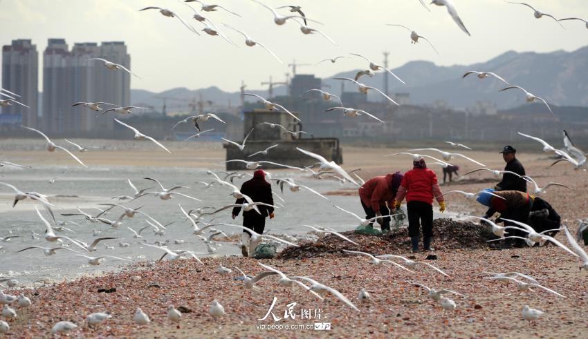 2014年11月12日,山东省烟台市正值秋冬,烟台高新区沿海养殖户开始收获扇贝,渔民加工扇贝后抛弃的扇贝残渣吸引近万只海鸥前来觅食,大量海鸥聚集在海滩争相抢食,场面蔚为壮观。(栾盛杰/人民图片)