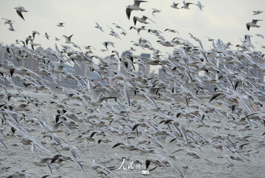 2014年11月12日,山东省烟台市正值秋冬,烟台高新区沿海养殖户开始收获扇贝,渔民加工扇贝后抛弃的扇贝残渣吸引近万只海鸥前来觅食,大量海鸥聚集在海滩争相抢食,场面蔚为壮观。(栾盛杰/人民图片)
