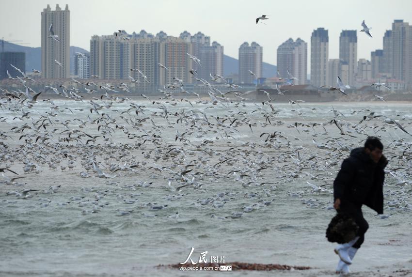 2014年11月12日,山东省烟台市正值秋冬,烟台高新区沿海养殖户开始收获扇贝,渔民加工扇贝后抛弃的扇贝残渣吸引近万只海鸥前来觅食,大量海鸥聚集在海滩争相抢食,场面蔚为壮观。(栾盛杰/人民图片)