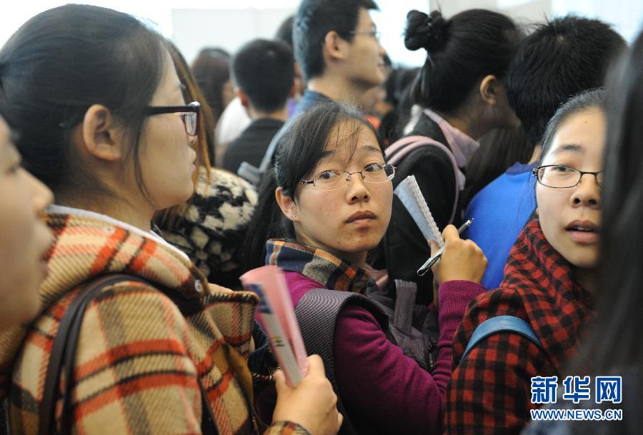 11月12日,在江苏南京,毕业生在用人单位招聘摊位前应聘。当日,江苏省2015届医药卫生类毕业生人才交流大会在南京国际展览中心举行,省内近400家医疗卫生单位提供1.3万多个岗位,众多毕业生前来寻找理想的工作。新华社记者孙参摄