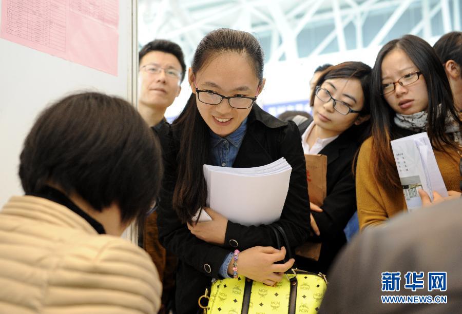 11月12日,在江苏南京,毕业生在用人单位招聘摊位前应聘。当日,江苏省2015届医药卫生类毕业生人才交流大会在南京国际展览中心举行,省内近400家医疗卫生单位提供1.3万多个岗位,众多毕业生前来寻找理想的工作。新华社记者孙参摄