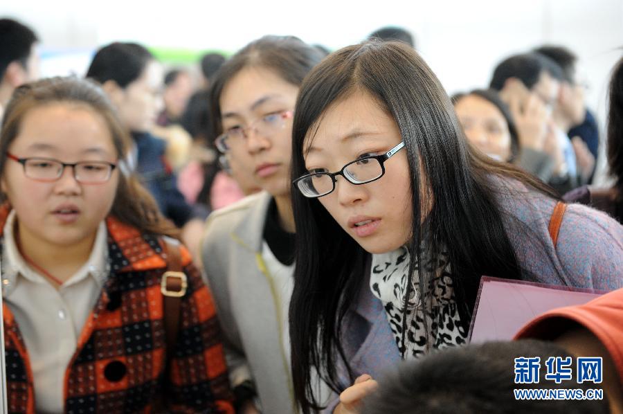 11月12日,毕业生在用人单位招聘摊位前应聘。当日,江苏省2015届医药卫生类毕业生人才交流大会在南京国际展览中心举行,省内近400家医疗卫生单位提供1.3万多个岗位,众多毕业生前来寻找理想的工作。新华社记者孙参摄