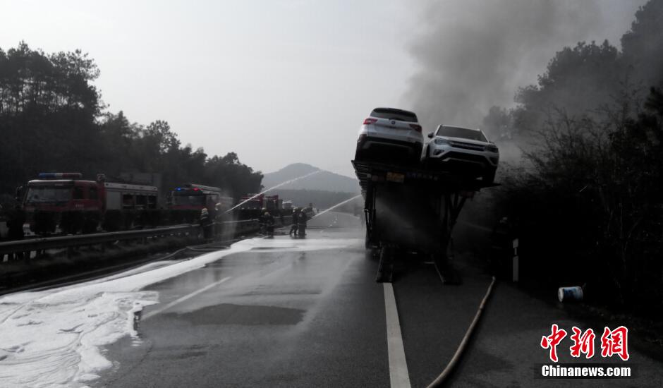 11月12日8时37分许,一辆满载20辆小汽车的挂车(车牌号:黑MR688)途经大广高速公路江西上高境内,因轮胎自燃造成8辆小汽车不同程度烧损。驾驶员称,车辆从北京出发,准备运往厦门,仅被烧毁的新车损失就达150多万元。熊高源 摄