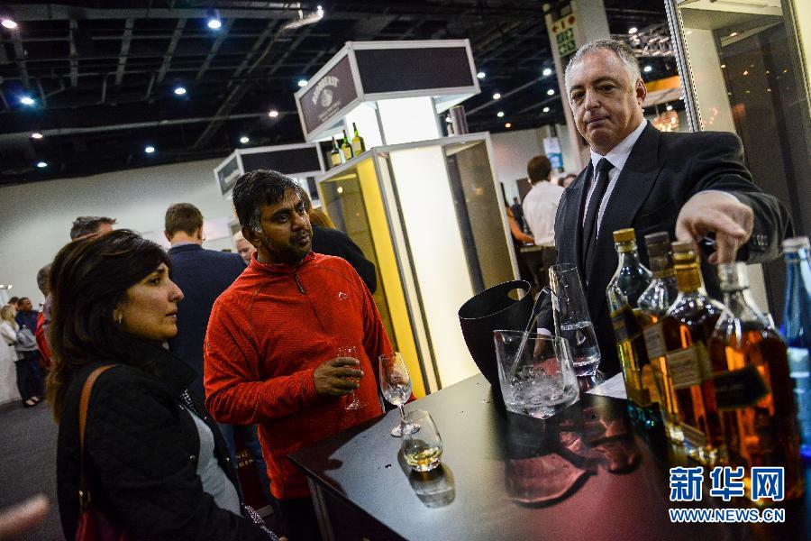 11月12日,在南非约翰内斯堡举行的南非2014FNB威士忌酒节上,一名尊尼获加品牌的工作人员(右)向参观者介绍该品牌产品。南非2014FNB威士忌酒节于11月12日至14日在约翰内斯堡举行。威士忌酒迷们可以在3天的时间里品尝和欣赏超过150种来自全球各地的威士忌名酒。此外,观众还可参加各种品酒讲座,学习威士忌酒鉴赏知识。 新华社记者翟健岚摄