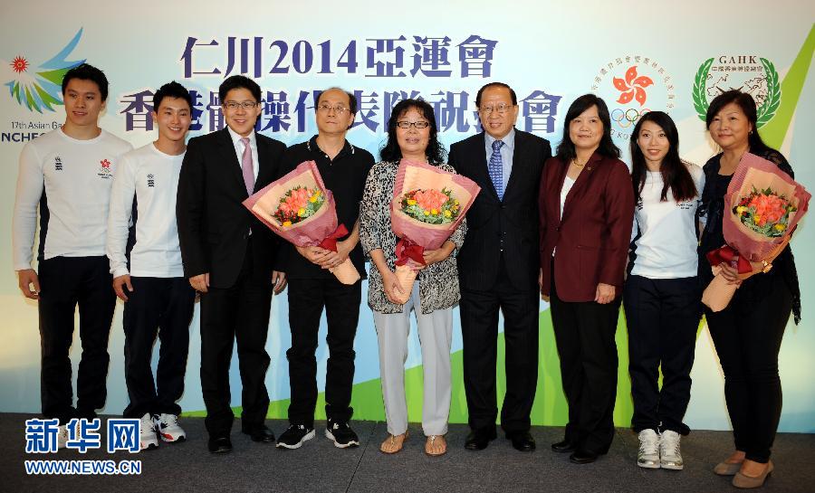 11月10日,中国香港体操总会会长霍启刚(左三)、中国香港体操总会荣誉会长贝钧奇(右四)、香港运动员石伟雄(左二)、吴翘充(左一)、黄晓盈(右二)合影。当日,中国香港体操总会在香港举行第十七届仁川亚洲运动会祝捷会,祝贺香港运动员石伟雄获得跳马金牌。 新华社记者卢炳辉摄