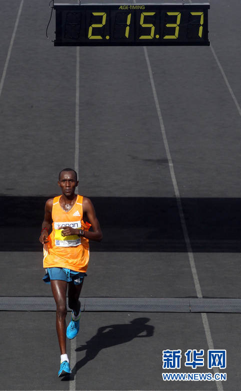 在9日举行的第32届雅典始祖马拉松比赛中,肯尼亚选手科贝(Josphat Kiptanui Too Chobei)以2小时15分38秒的成绩获得男子组第三名。图为科贝冲向终点。罗洛斯摄 新华网发