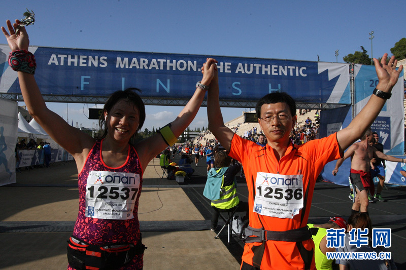 在9日举行的第32届雅典始祖马拉松比赛中,参加全程马拉松、5公里跑、10公里跑以及其他赛事的总人数为3.5万人,创历史新高,其中包括约300名中国长跑运动爱好者。图为两名中国选手和其他运动员一起跑进大理石体育场。罗洛斯摄 新华网发