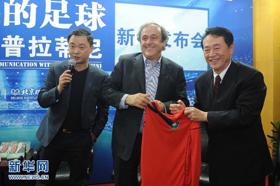 11月10日,金志扬(右)代表北京理工大学向欧足联主席普拉蒂尼(中)赠送北京理工大学足球队10号球衣作为纪念。当日,欧洲足联主席普拉蒂尼现身北京理工大学,出席新书《穿着西装的足球——对话普拉蒂尼》发布会,并与中国球迷见面。 新华社发(陆宇烁摄)