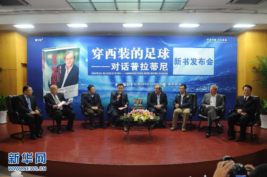 11月10日,欧足联主席普拉蒂尼(左四)出席新书发布会。当日,欧洲足联主席普拉蒂尼现身北京理工大学,出席新书《穿着西装的足球——对话普拉蒂尼》发布会,并与中国球迷见面。 新华社发(陆宇烁摄)