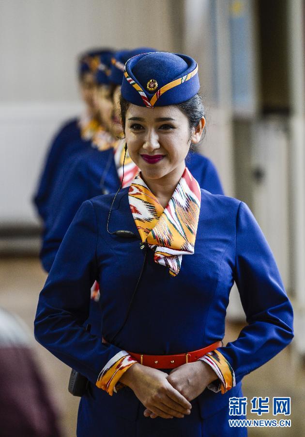 11月10日,乌鲁木齐客运段动车队的“动姐”地里达尔·阿卜都拉(前)和她的同事们在进行形体训练。新华社记者 赵戈 摄