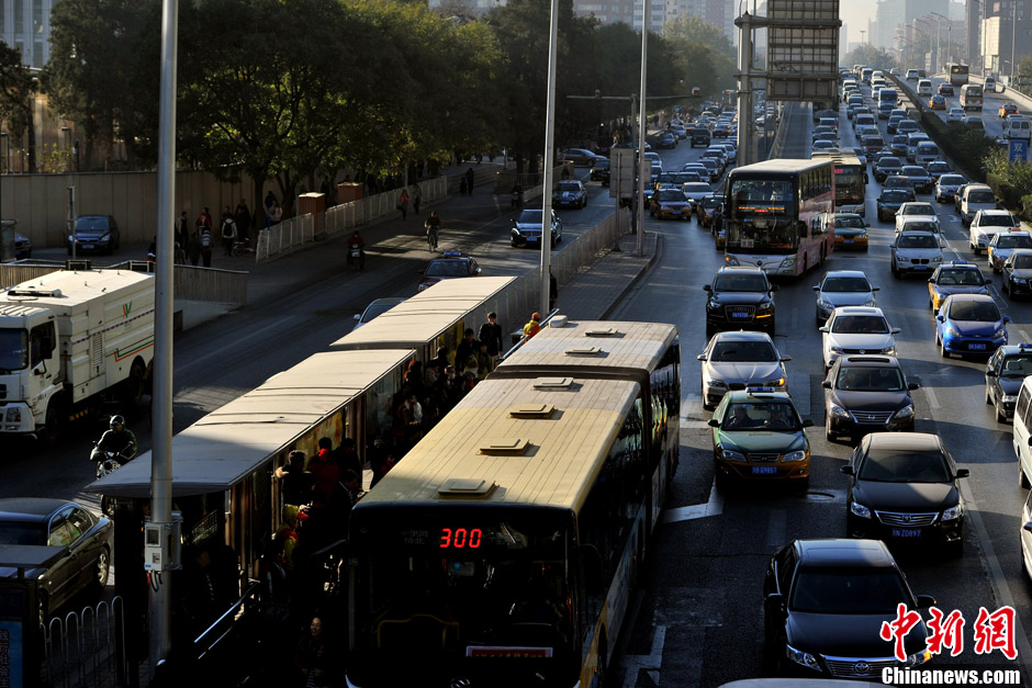 11月13日,北京单双号限行措施结束,尾号限行恢复。图为尾号限行轮换限行措施恢复第一天,北京早高峰环路等路段交通拥堵状态。中新网记者 金硕 摄