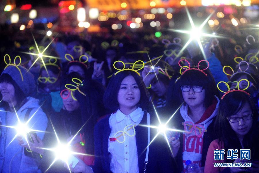 新华社照片,沈阳,2014年11月11日 沈阳1111名大学生“光棍节”向爱出发萤光夜跑 11月11日,大学生在参加萤光夜跑活动。 11月11日被年轻人昵称为光棍节,当晚,来自沈阳高校的1111名大学生在沈阳奥林匹克体育中心举行“11.11向爱出发”主题萤光夜跑活动,以此欢度“光棍节”,释放青春与活力。新华社发(张文魁 摄)