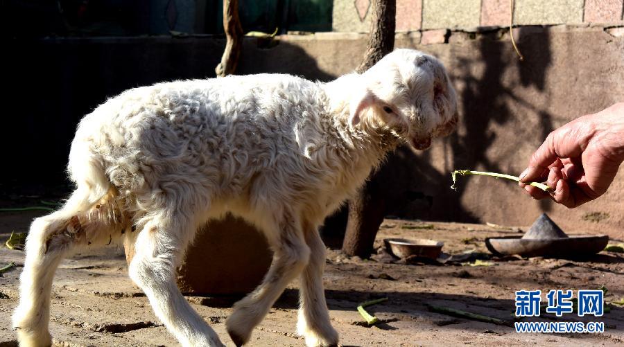 11月12日,村民在山东省昌乐县三河村徐金奎家中喂食“双头羊”。