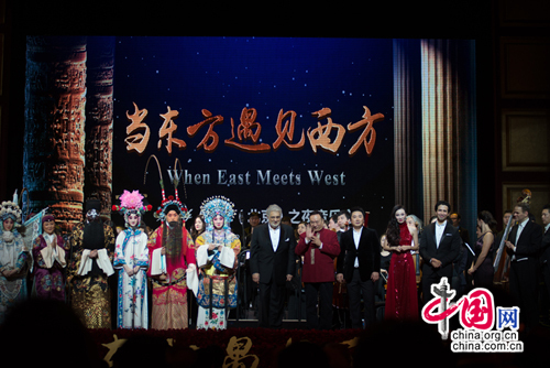 中国网11月10日讯 2014年11月9日,“当东方遇见西方”在华彬歌剧院唱响。初冬的歌剧院灯火璀璨,世界著名三大男高音之一、西班牙著名歌唱家普拉西多•多明戈再度携手国内外众多京剧歌剧表演艺术家,奉献了一出西方经典歌剧与中国国粹京剧同台辉映的音乐会。