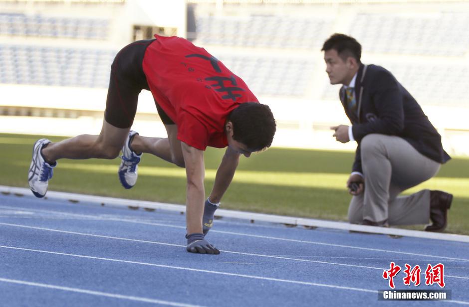 当地时间2014年11月13日,日本东京,18岁的Katsumi Tamakoshi在驹泽奥林匹克公园体育场的跑道上手脚并用,创造了100米四肢跑15.86秒的吉尼斯世界纪录。