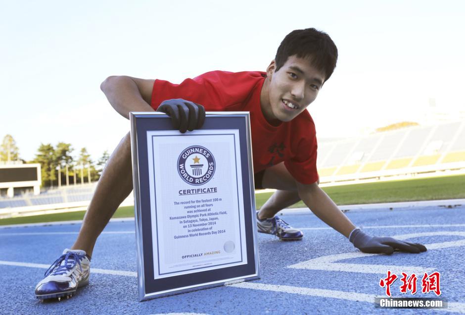 当地时间2014年11月13日,日本东京,18岁的Katsumi Tamakoshi在驹泽奥林匹克公园体育场的跑道上手脚并用,创造了100米四肢跑15.86秒的吉尼斯世界纪录。