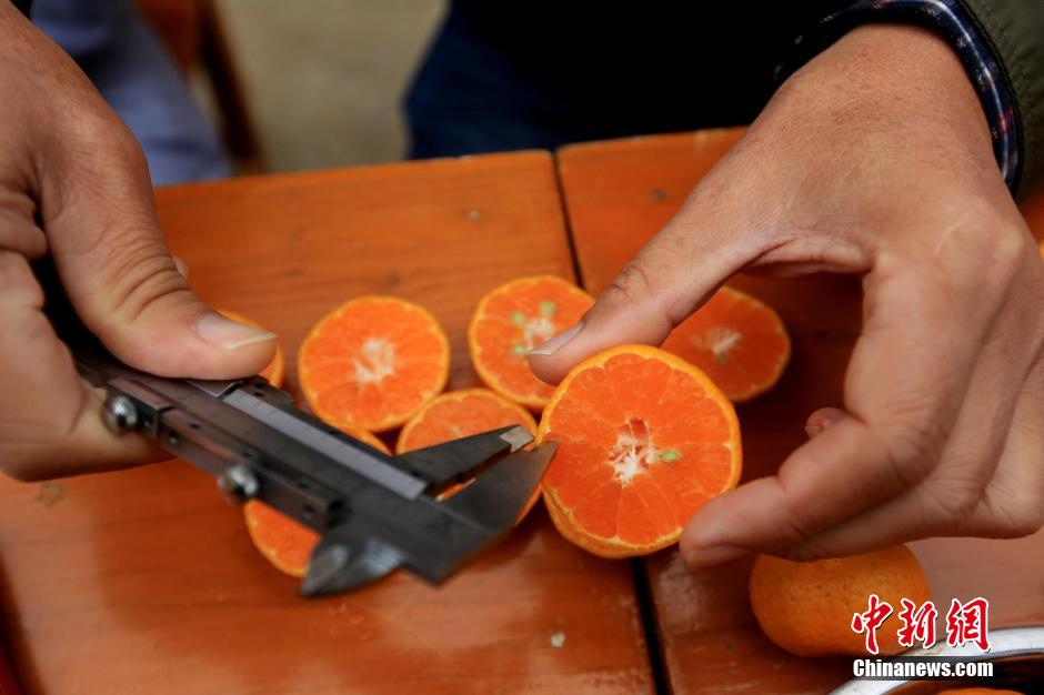 11月13日,工作人员在广西柳州市柳城县邬家屯文化广场对参赛蜜桔测量桔皮厚度。 谭凯兴 摄