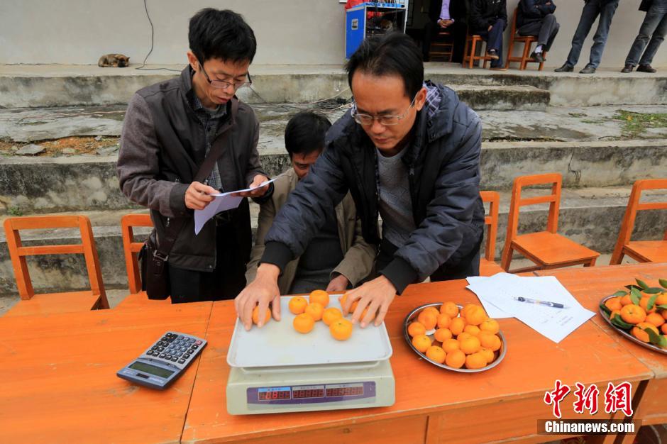 11月13日,在广西柳州市柳城县邬家屯文化广场,两名农业技术人员在对参赛蜜桔进行称重。 谭凯兴 摄