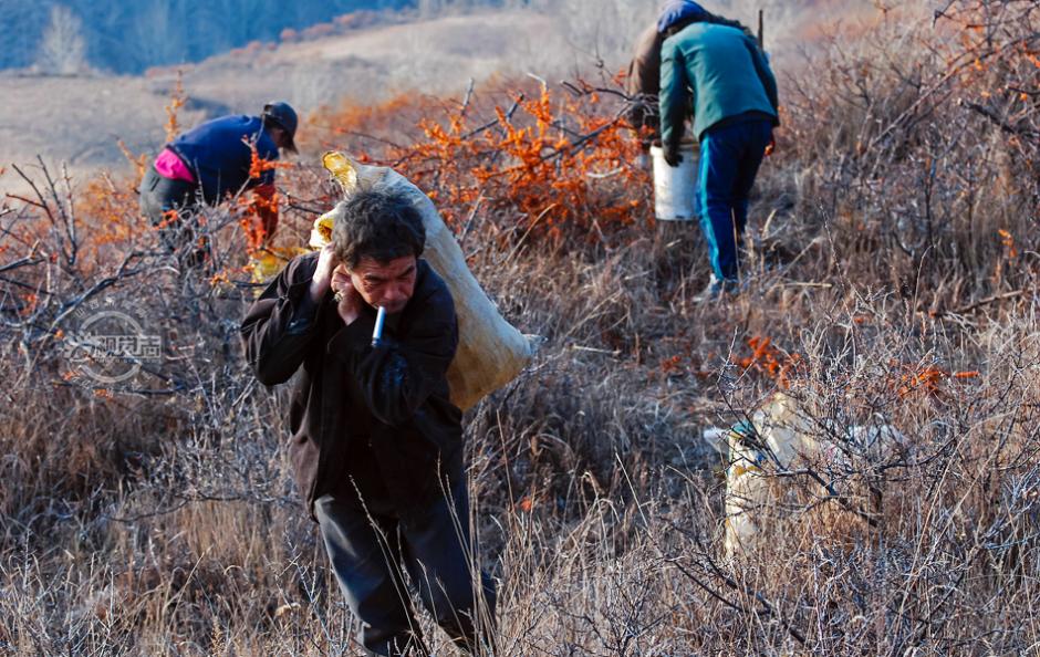 王怀珍把装满沙棘的袋子背到车上。图片来源:山西新闻网
