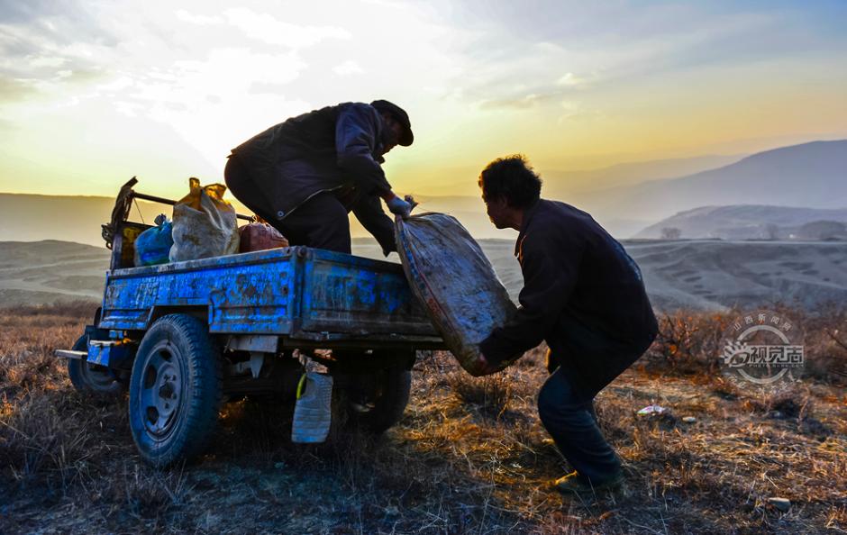 王怀珍与他叔叔把装满沙棘的袋子搬上车。图片来源:山西新闻网
