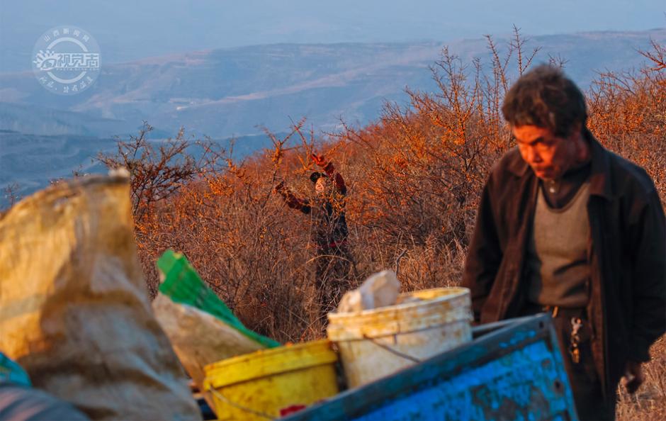 袋子装满了,他妻子看到满枝果实的沙棘树又忍不住剪了几枝。图片来源:山西新闻网