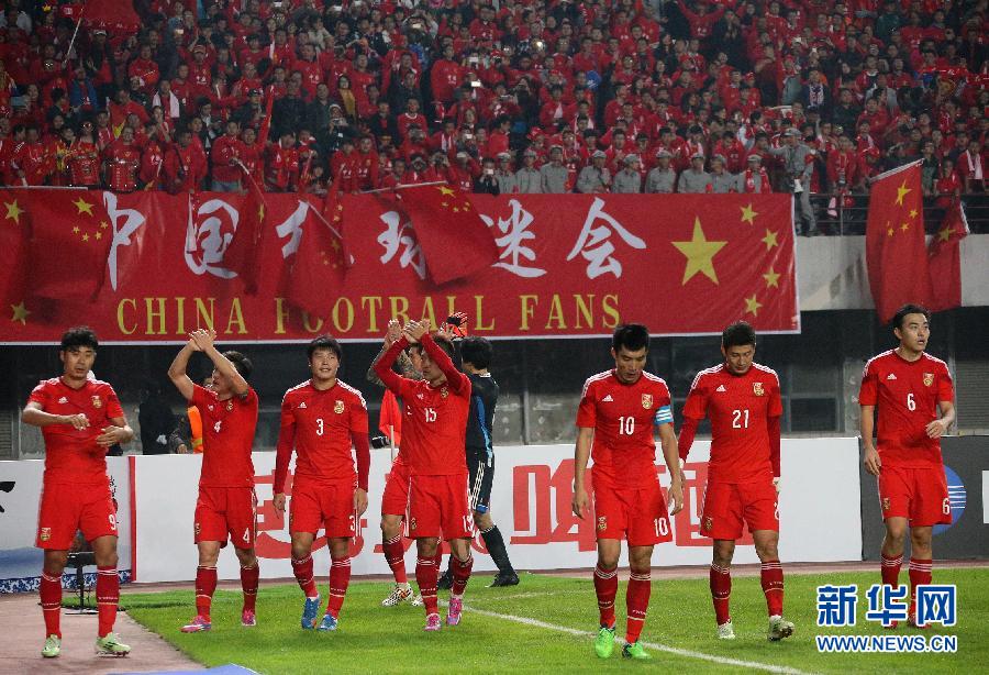 11月14日,中国队球员在赛后向观众致意。当日,在南昌奥体中心体育场进行的国际足球友谊赛中,中国队以1比1战平新西兰队。 新华社发(万象摄)