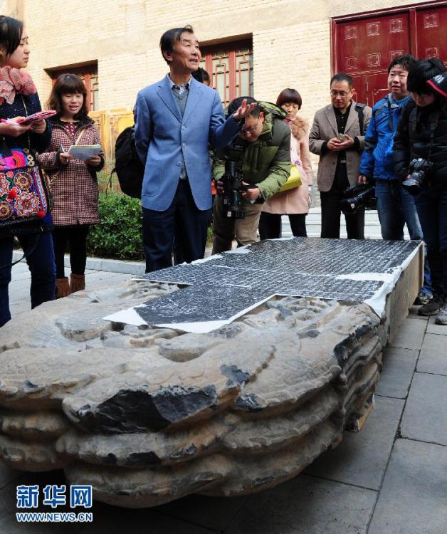 11月14日,西安碑林博物馆馆长赵力光(左三)在介绍这座唐碑。近日,陕西西安碑林博物馆征集到一座唐武周时期碑刻。此碑为唐郢州刺史杨府君之墓碑,高300厘米,厚32厘米,最宽102厘米。碑额书题“大周故郢州刺史杨府君之碑”,碑文为楷书,共34行,2500余字,碑文中记载了隋末唐初的多次战争。因碑中使用了大量武则天时期所造文字,可以断定立碑年代在武周时期。这座唐碑是碑林博物馆征集到的首座唐武周时期碑刻。丁海涛 摄 图片来源:新华网