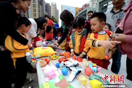 11月14日,福州文博小金星幼儿园的孩子们将自己家里的玩具带到学校“跳蚤市场”义卖,活动受到孩子家长的热情支持,义卖所得款全部捐献给福州福利院的小朋友。王东明 摄