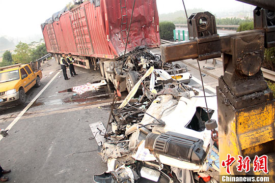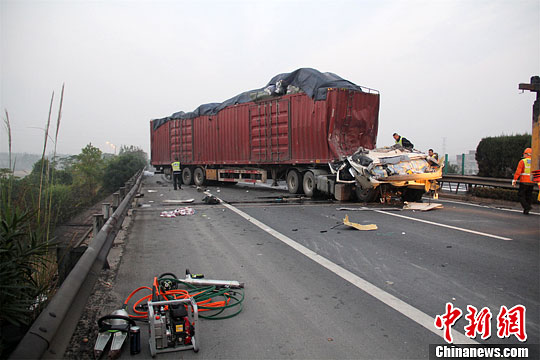 11月14日凌晨5点40分左右,G60沪昆高速公路浙江衢州段往杭州方向441公里+600米附近,两辆绍兴牌照的重型半挂货车发生追尾事故,事故造成后车驾驶室严重变形,几乎被压扁,导致该车司机当场死亡,另一乘客腿部受伤送医。目前,事故原因高速交警部门正在进一步调查。
