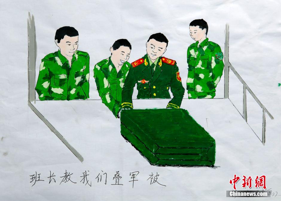 马杰是武警福建总队三明支队新训大队的一名大学生新兵,擅长绘画的他,用画笔记录下新训生活的点滴感悟。入伍两个多月,他利用课余时间通过素描、速写、色彩的形式画出了20多幅反映新兵连生活的漫画,一幅漫画记录一个故事,一幅漫画见证一段成长。战友们日常学习、训练、生活的素材统统被他收录到自己的军旅画册里,成了新兵教育的活教材。崔节磊 摄
