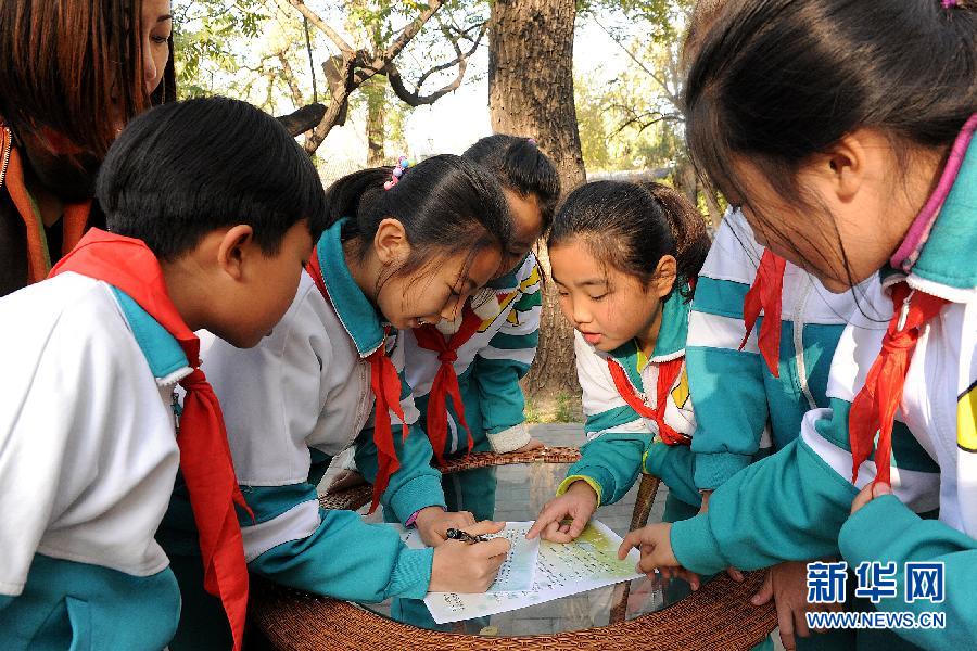 新华社照片,北京,2014年11月14日 社会大课堂 学生们在户外课上研究如何完成老师留下的户外作业(摄于11月13日)。 11月13日,以“名人、名居、名木”为主题的北京市中小学生社会大课堂现场观摩会在北京宋庆龄故居举行。来自鸦儿胡同小学的学生们听老师讲述了宋庆龄的故事及宋庆龄故居的历史;同学们还在故居里开展寻找名木、名花的互动环节,培养团结协作精神。新华社记者 何俊昌 摄