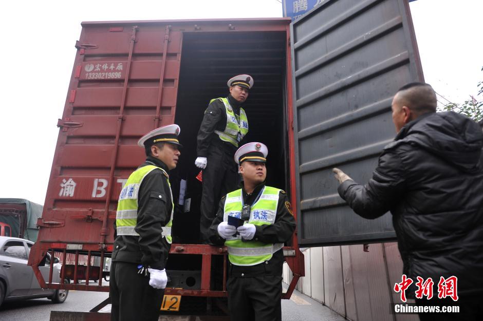 11月13日,为预防重特大交通事故发生,重庆市南岸区公安分局交巡警支队联合交通执法、安监等部门正式开展“六打六治”打非治违专项行动,严查各类危化品非法运输和客车违规运营的交通违法行为。无证经营、非法改装、违规装载等非法运输危险品行为,及客车超速、超员等违规行驶已成为交通安全重要隐患。图为执法人员正在进行运输车辆检查。 陈超 摄