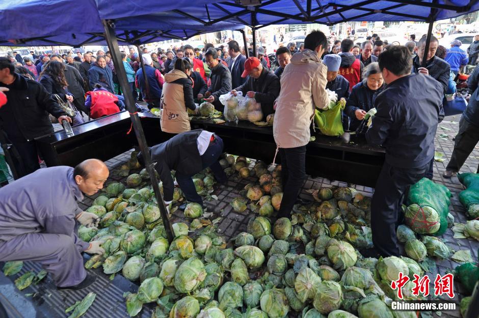 11月13日,山西太原,民众排长队免费领取茴子白(圆白菜)。近日,山西晋中市多地茴子白滞销,不少爱心企业前去收购,并免费发放给民众,仅仅一周时间,太原有约10场免费发放茴子白的活动,发放茴子白近百吨。 中新社发 武俊杰 摄