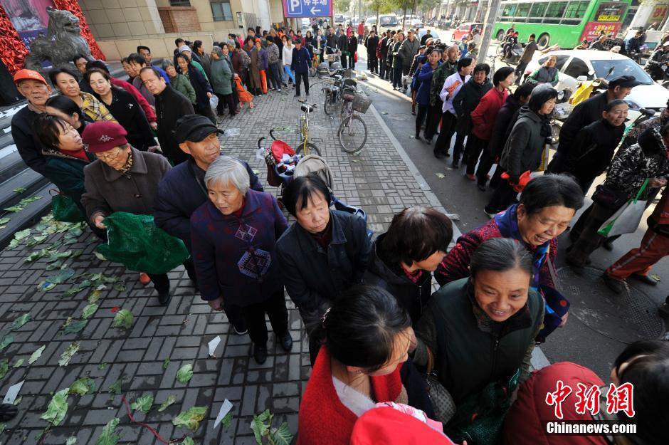 11月13日,山西太原,民众排长队免费领取茴子白(圆白菜)。近日,山西晋中市多地茴子白滞销,不少爱心企业前去收购,并免费发放给民众,仅仅一周时间,太原有约10场免费发放茴子白的活动,发放茴子白近百吨。 中新社发 武俊杰 摄