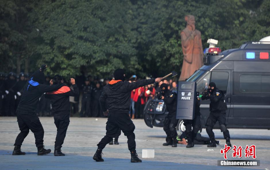11月13日下午,四川乐山市为有效打击各类暴力恐怖活动,提升处置能力,武警、公安、消防、卫生等联合举行“综合反恐防暴”演练。此次演练目的,是检验各兵种间的配合、快速处置等能力,形成全社会共同参与反恐防暴工作的局面。刘忠俊 摄