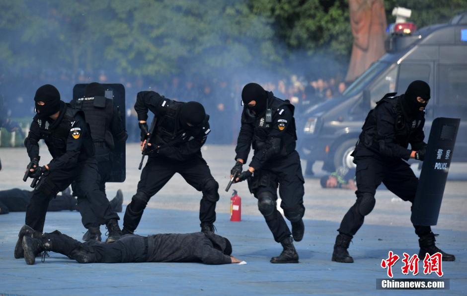 11月13日下午,四川乐山市为有效打击各类暴力恐怖活动,提升处置能力,武警、公安、消防、卫生等联合举行“综合反恐防暴”演练。此次演练目的,是检验各兵种间的配合、快速处置等能力,形成全社会共同参与反恐防暴工作的局面。刘忠俊 摄