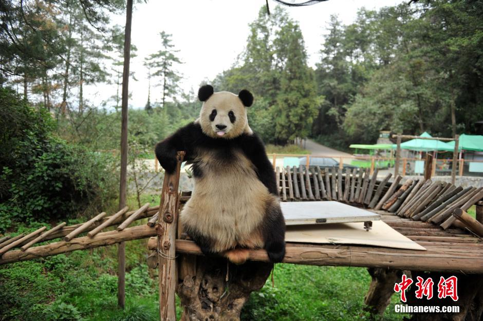 11月13日,云南野生动物园的大熊猫思嘉搞完破坏之后向周围的观众卖萌。当日,云南野生动物园计划为大熊猫思嘉测体重,但聪明的思嘉却不肯配合饲养员而搞起破坏,咬断电子称显示屏的连接线,让动物园的体检计划泡了汤。中新社发 刘冉阳 摄