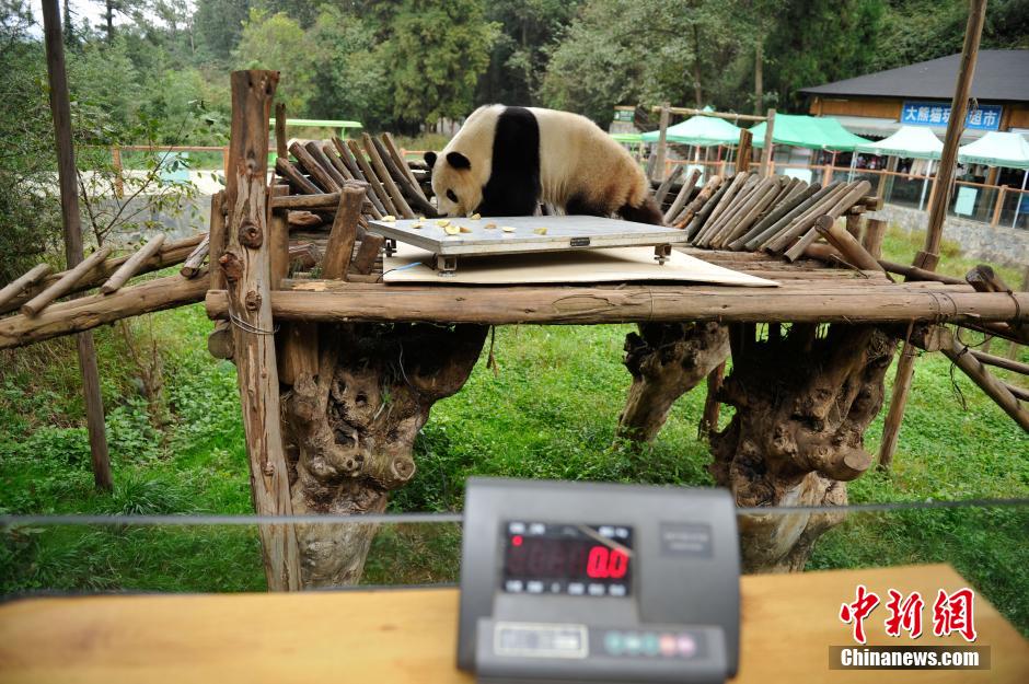11月13日,云南野生动物园为测量大熊猫思嘉的体重做了准备充分,还在称上放了苹果引诱熊猫,但聪明的思嘉却不肯配合饲养员而搞起破坏,咬断电子称显示屏的连接线,让动物园的体检计划泡了汤。中新社发 刘冉阳 摄
