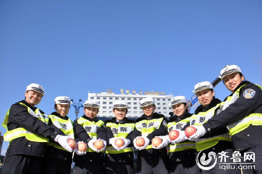 11月13日,在烟台南大街与西南河路路口处,烟台市交警支队第一大队的8名警花手捧印有“烟台苹果祝您平安”字样的苹果,以快闪的方式向过往驾驶人送平安,号召烟台市民安全文明出行,祝福苹果之乡的父老乡亲幸福平安。图片来源:齐鲁网