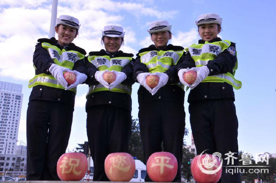 11月13日,在烟台南大街与西南河路路口处,烟台市交警支队第一大队的8名警花手捧印有“烟台苹果祝您平安”字样的苹果,以快闪的方式向过往驾驶人送平安,号召烟台市民安全文明出行,祝福苹果之乡的父老乡亲幸福平安。图片来源:齐鲁网