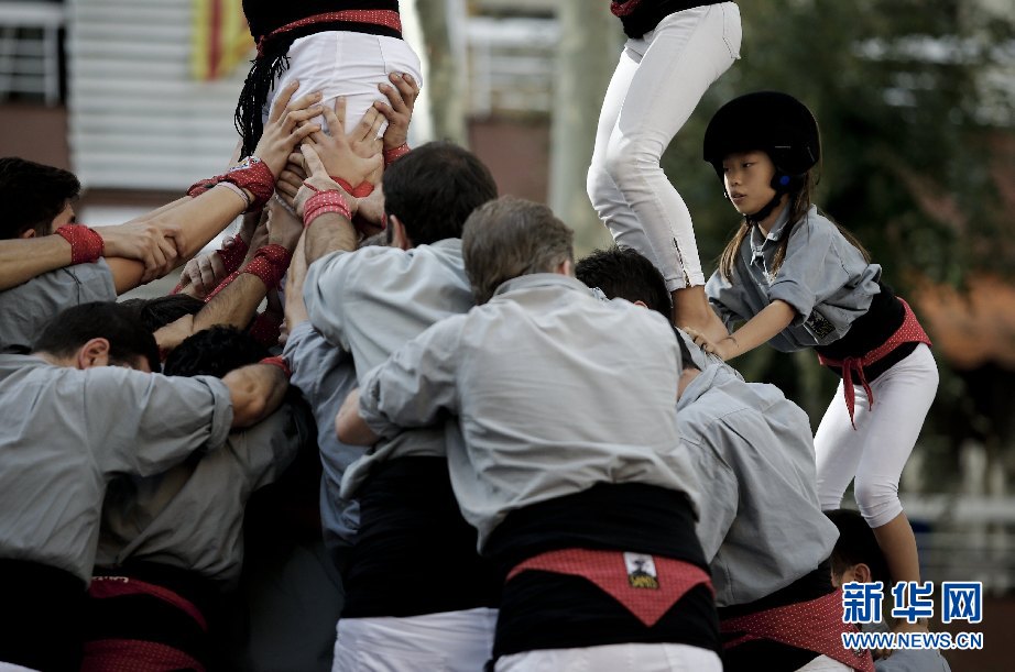 表演中,Jana开始爬“人塔”。新华社巴塞罗那分社摄影师Pau Barrena 摄