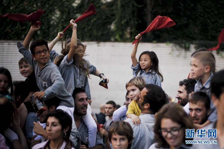 表演结束后,Jana和同伴们一起庆祝“叠人塔”成功。新华社巴塞罗那分社摄影师Pau Barrena 摄